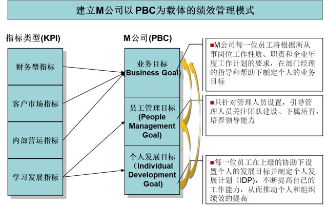 具体举措:建立个人业绩承诺(PBC)体系,形成公司业务目标、管理目标和员工个人发展目标相结合的绩效管理体系,使员工与公司共同成长;强化绩效循环,重视绩效计划的制定、监督、辅导及反馈沟通环节,真正提高员工的能力;薪酬绩效互动,绩效指标值要具有挑战性,强化绩效结果的执行和应用,明确区分优劣。