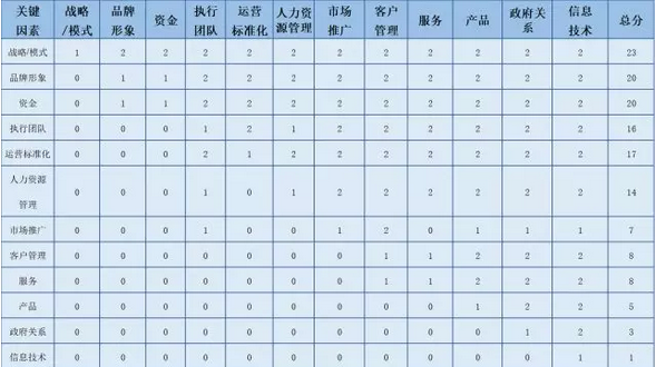 备注:如果横轴项目如“资金”的重要性超过纵轴项目如“产品”,则填2分,如果同样重要,则填1分,如果没有纵轴重要,则填0分