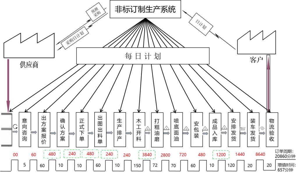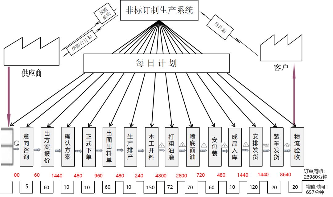 在确定非标车间前,客户(经销商)普遍不满意的就是交期时间长,而且具体时间很不确定,非标车间的日产能只有33.2套/天,非标车间整个的产品交期为45天,而且在这个基础上的准时交货率还只有14%。