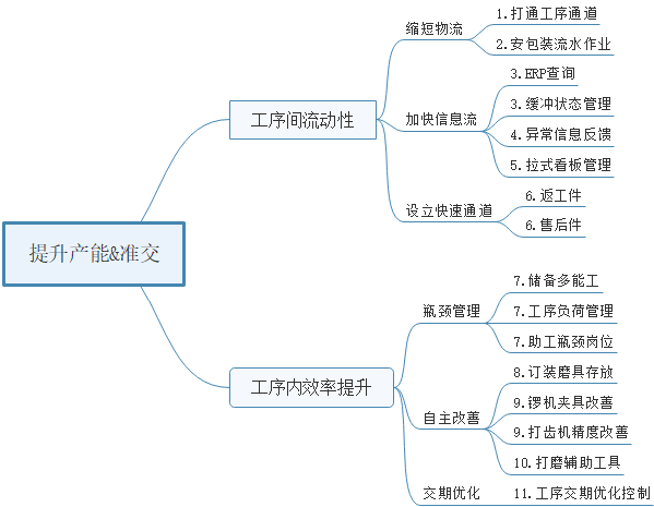 按照和垚咨询的项目管理模式,和垚顾问与客户成立联合项目组,利用鱼骨图、柏拉图、价值流图等进行系统的分析,确定了以下的改善措施:针对不同的环节,主要推动2大板块,6个层面,总共16个改善方案进行改善。