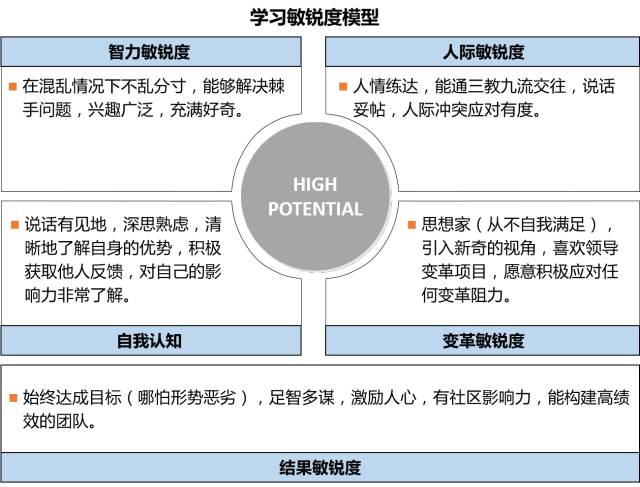 很多企业的疑惑是“我知道潜力很重要”,但是这个东西如何衡量?每个企业都有一套适合公司文化、适用于员工的能力模型。例如,德勤在识别高潜力员工时,会借助“学习敏锐度模型”来判断候选人的潜力。在实际招聘工作中,可通过假设性问题、无领导小组讨论等考察人才的行为特质,分析判断人才的培养方向与发展定位。
