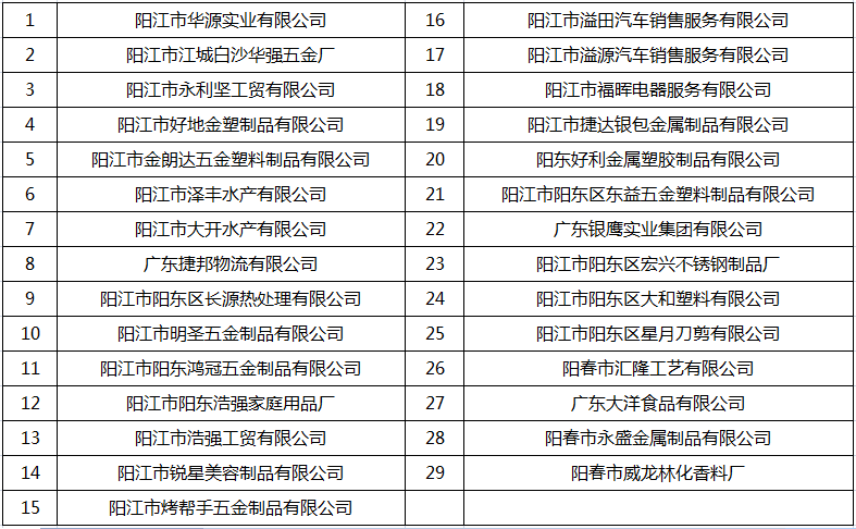 阳江市中小微企业信贷风险补偿资金重点企业池入池第三批申请企业共31家,经资料初审、现场尽调、信息核证、风险评审、信誉外调、第三方机构评审、政府网公示等方面的工作,并经领导小组核准,共有 29 家企业符合入池条件,认定为阳江市中小微企业信贷风险补偿资金重点企业池企业,名单如下: