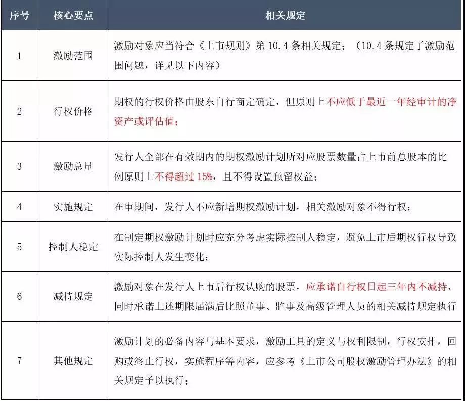 但对于科技类企业,由于创业初期业务不稳定、人员流动性大、股权资源有限,通常多采用期权模式,特别是红筹和VIE架构企业,往往存在尚未行权完毕的期权。如果此类企业要准备IPO,就面临在申报时要加速行权或终止期权计划。本次科创板优化了股权激励相关规定,允许存在上市前制定、上市后实施的期权激励计划,但原则上要符合下列要求: