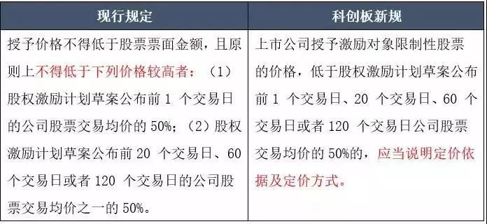 科创板增强了股权激励价格条款的灵活性。在现行规定下,限制性股票的授予价格,原则上不得低于激励计划公布前1个交易日股票交易均价的50%以及前20个交易日、前60个交易日、前120 个交易日股票交易均价之一的50%。《持续监管办法》及《上市规则》取消了上述监管要求,对于授予价格低于市场参考价50%的,仅要求独立财务顾问对股权激励计划的可行性、相关定价依据和定价方法的合理性、是否有利于公司持续发展、是否损害股东利益等发表意见。此次放宽限制性股票的价格限制,将更加有利于科创公司股权激励的实施,有效发挥人才的激励作用。