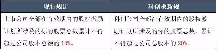 上市公司可以同时实施多项股权激励计划。《持续监管办法》第二十五条规定:科创公司全部在有效期内的股权激励计划所涉及的标的股票总数,累计不得超过公司总股本的20%。而现行规定下,上市公司全部在有效期内的股权激励计划所涉及的标的股票总数累计不得超过公司股本总额的10%。比例上,由10%提升至20%,可以为科创企业未来吸引和保留人才预留更大的空间。