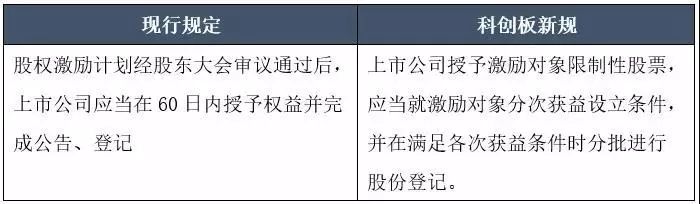 科创板新增了限制性股票类型:符合股权激励计划授予条件的激励对象,在满足相应获益条件后分次获得并登记的本公司股票。按照现行规定,限制性股票计划经股东大会审议通过后,上市公司应当在60日内授予权益并完成登记。从实践看,部分上市公司授予限制性股票后,由于未达到解除限售条件,需要回购注销。针对此种情况,科创板在新的限制性股票类型中,取消了上述60日的期限限制,允许激励对象在满足相应条件后,上市公司再行将限制性股票登记至激励对象名下,便利了实施操作。