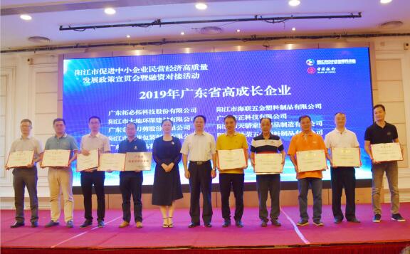 广东省工业和信息化厅融资促进处周明副调研员、阳江工业和信息化局黄碧俏副局长分别为我市2019年荣获省工业和信息化厅评定的“广东省高成长中小企业”荣誉称号的9家企业颁发牌匾和荣誉证书。
