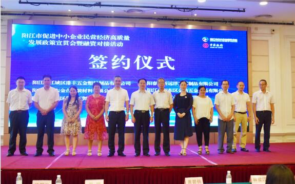 为宣贯中央和省促进中小企业民营经济高质量发展政策措 施,深入开展政银企合作,推进对我市“小升规”及培育企业、 高成长中小企业、专精特新“小巨人”企业等中小(民营)企业的融资服务,进一步缓解中小(民营)企业融资难融资贵融资慢的问题,推动中小(民营)企业高质量发展,在省工业和信息化厅的具体指导和支持下,7月19日,由阳江市工业和信息化局、广东省中小企业服务中心主办,阳江市中小企业服务中心承办,中国银行阳江分行协办的“2019年阳江市促进中小企业民营经济高质量发展政策宣贯会暨举办融资对接活动”成功举办。