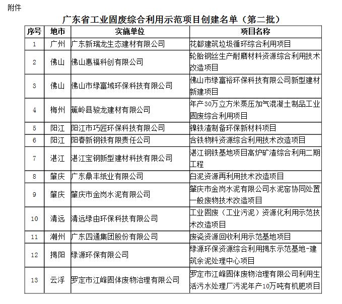 附件:广东省工业固废综合利用示范项目创建名单(第二批)