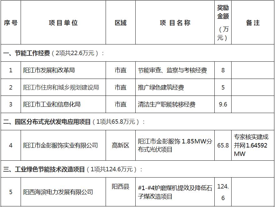 为大力推进生态文明建设,鼓励工业固体废物资源化利用,促进工业绿色改造,打好污染防治攻坚战,充分发挥财政资金的引导作用。我局印发了《关于组织申报2019年阳江市节能专项资金项目的通知》(阳工信通〔2019〕222号),经企业自愿申报,县(市、区)经信局初审推荐,我局组织专家对项目进行评审,本次包含园区分布式光伏发电应用项目、工业绿色节能技术改造项目、清洁生产企业审核认定项目共3个专题方向、3个部门节能工作经费和1个项目评审验收及绩效经费,拟安排财政资金225万元(见附表)。为体现公开、公正、公平原则,现予以公示。公示时间为2019年11月7日至2019年11月13日。如对下达计划有异议,请以书面形式向市工业和信息化局(工业节能与综合利用科)反映情况。