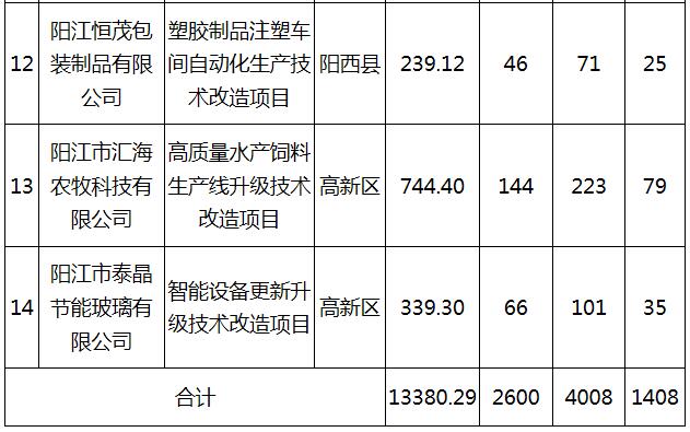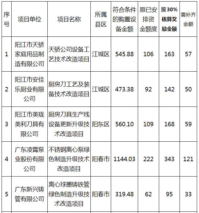阳江市2019年加大工业企业技术改造奖励力度(按标准落实奖励比例)资金项目补齐差额拟安排计划