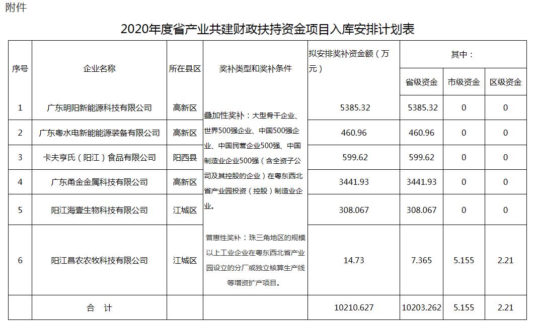 根据《广东省财政厅关于支持珠三角与粤东西北产业共建的财政扶持政策》(粤财工〔2016〕384号)、《广东省工业和信息化厅关于开展2019年省产业共建财政扶持资金项目入库工作的函》(粤工信园区函〔2019〕747号)、《阳江市工业和信息化局关于做好2020年省产业共建财政扶持资金项目入库工作的通知》(阳工信通〔2019〕255号)等相关文件规定,拟对广东粤水电新能能源装备有限公司有限公司等6家企业安排产业共建财政扶持资金资金10210.627万元(详见附件)。现将入库项目资金安排计划予以公示,如有异议,请向市工业和信息化局(工业园区科)反映。