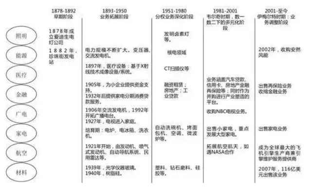 经验1:根据美国及全球经济变化,不断调整产业组合,实现发展空间的切换。通用电气为创始于1876年的爱迪生电灯公司,至今已有140年的历史,其业务也从最初的电力发展到业务多元的全球公司。通用电气以功能战略目标为导向,以两大准则:数一数二准则、3A准则指导业务空间扩张和收缩。2016年1月,通用电气将其家电业务以54亿美元的价格出售给中国家电巨头海尔,包括GE及其子公司所持有的家电业务资产。