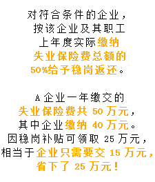 将继续对不裁员、少减员、符合条件的企业按企业发放援企稳岗补贴,补贴金额为2019年度实际缴纳失业保险费总额的50%!