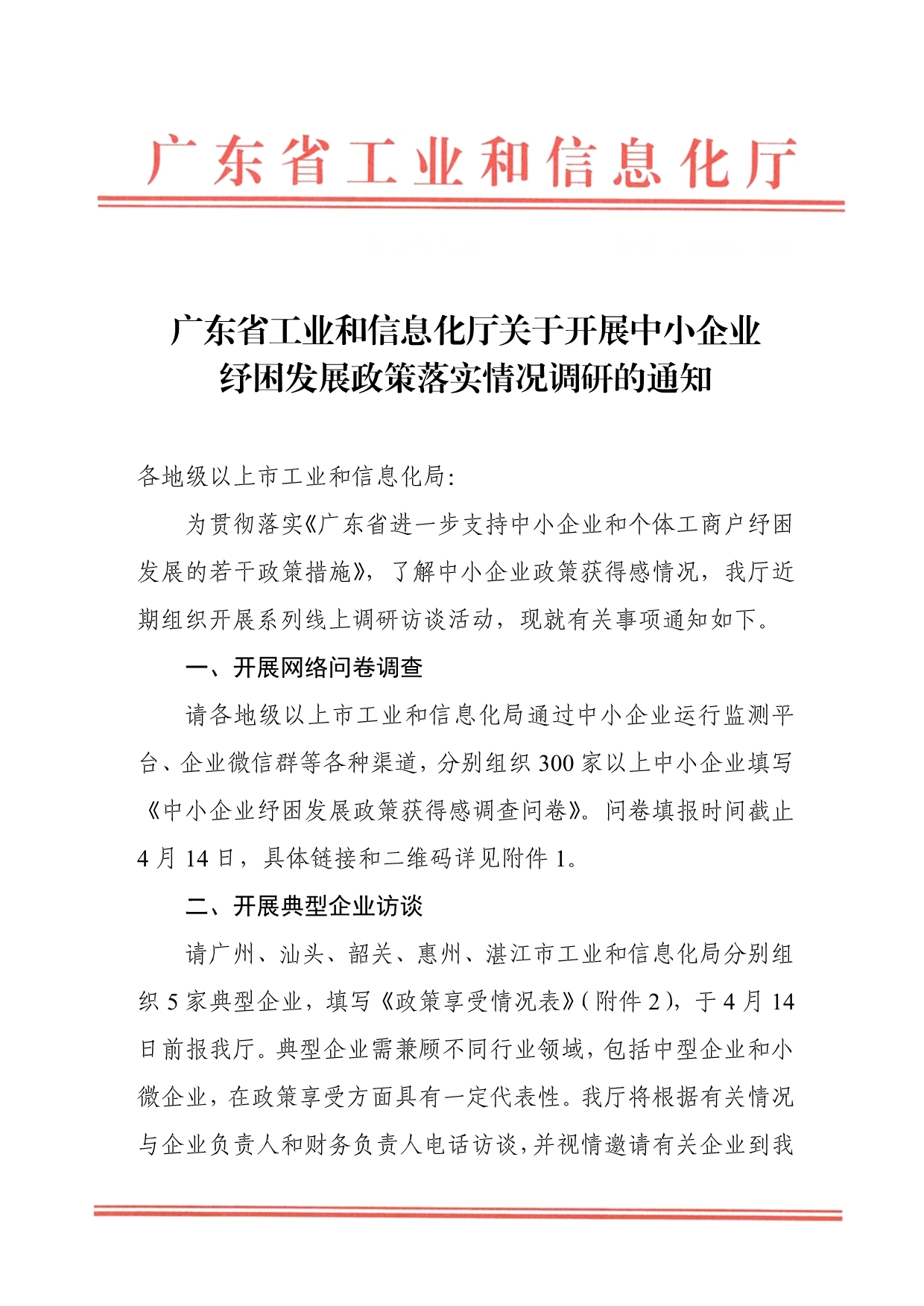 广东省工业和信息化厅关于开展中小企业纾困发展政策落实情况调研的通知(正文)