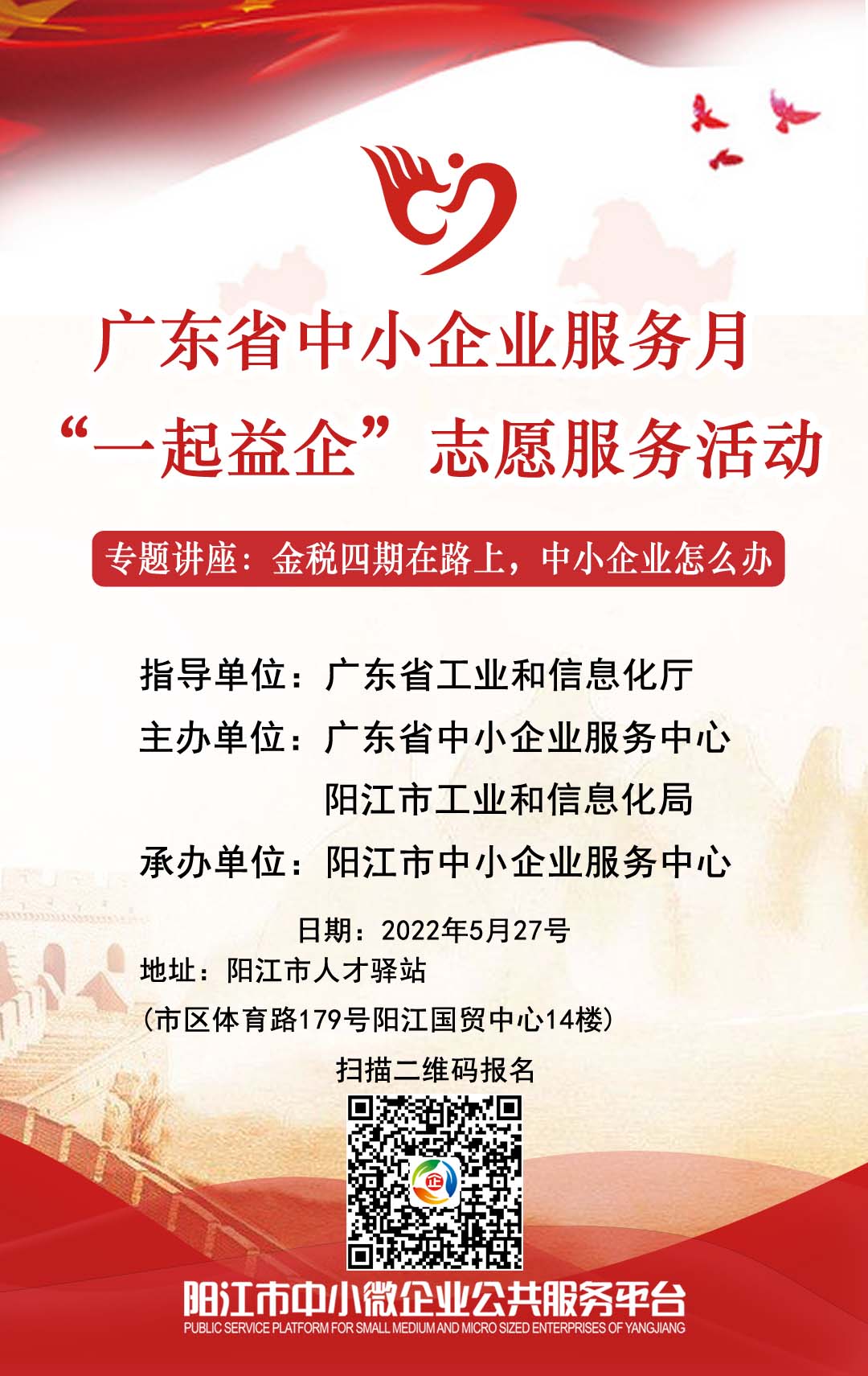 为深入贯彻落实《工业和信息化部办公厅关于开展“一起益企”中小企业服务行动的通知》(工信部企业函〔2022〕58号)、《广东省人民政府办公厅关于印发广东省进一步支持中小企业和个体工商户纾困发展若干政策措施的通知》(粤府办〔2022〕6号)、《广东省工业和信息化厅 广东省民政厅转发大力开展志愿服务促进中小企业发展指导意见的通知》(便函〔2020〕1095号)等文件精神,推进“志愿服务,爱心奉献”行动计划,践行“我为群众办实事”实践活动,以“宣传政策、落实政策,纾解难题、促进发展”为主题开展“一起益企”中小企业服务行动,充分发挥中小企业公共服务平台骨干支撑作用,汇聚和带动各类优质服务资源,组织服务进企业、进园区、进集群,为中小企业送政策、送管理、送技术,稳定市场预期,坚定发展信心,促进我省中小企业平稳健康发展,广东省中小企业服务中心与阳江市中小企业服务中心定于5月27日(星期五)联合开展“2022年广东省志愿服务促进中小企业发展活动(阳江站)”,有关事项通知如下: