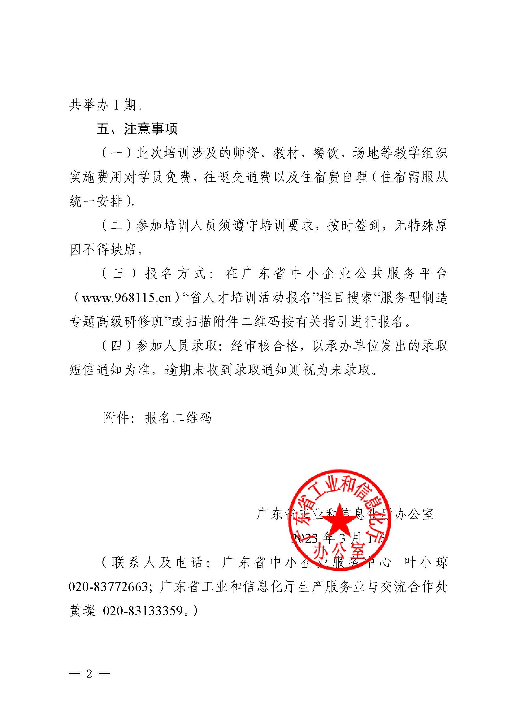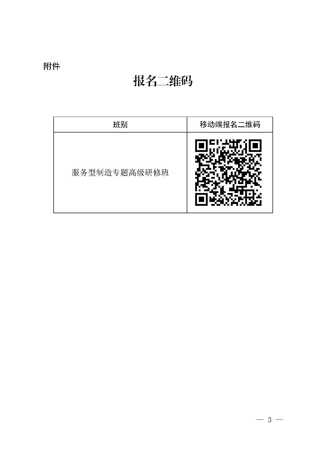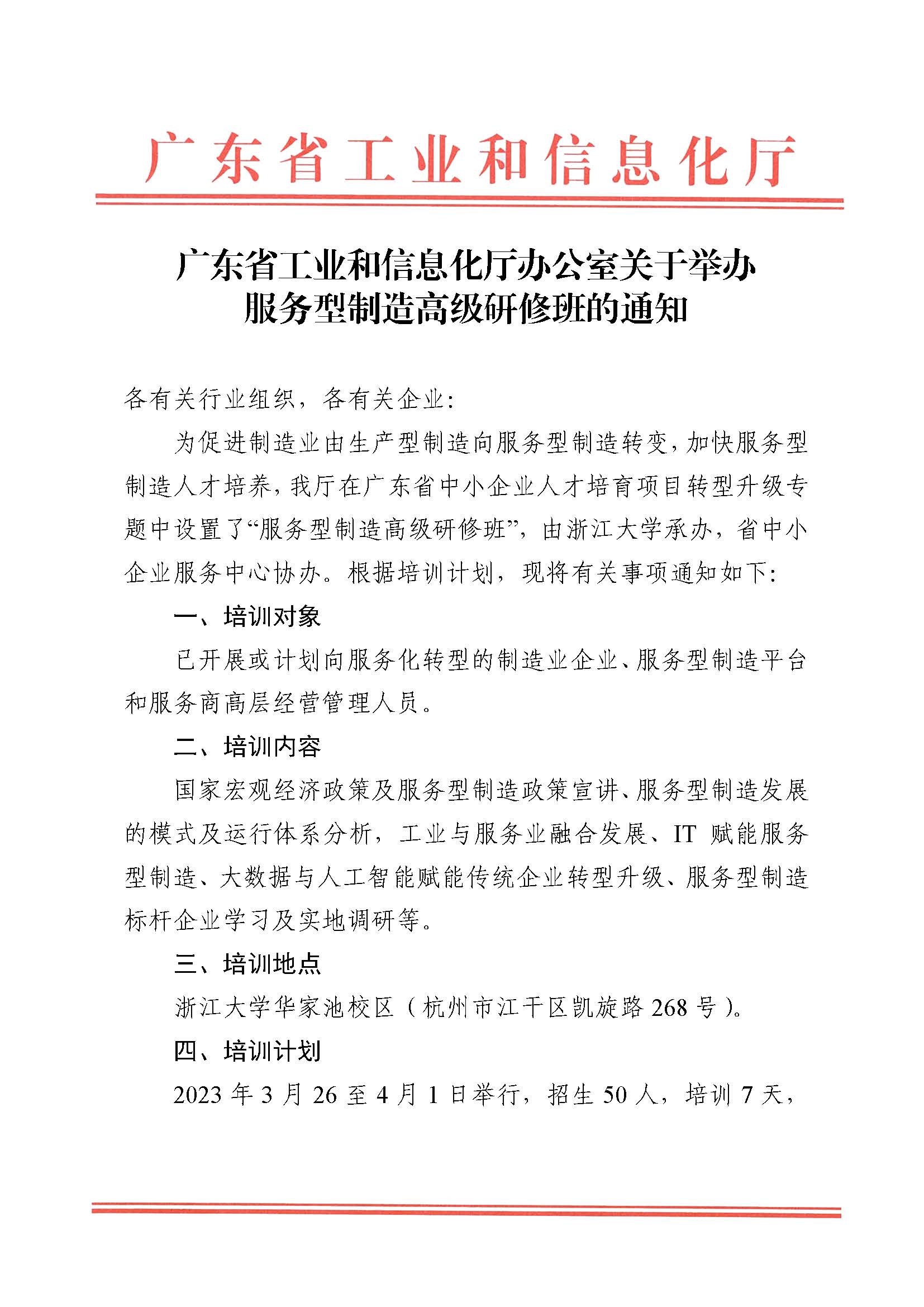 为促进制造业由生产型制造向服务型制造转变,加快服务型制造人才培养,广东省工业和信息化厅办公室在广东省中小企业人才培育项目转型升级专题中设置了“服务型制造高级研修班”,由浙江大学承办,省中小企业服务中心协办,面向已开展或计划向服务化转型的制造业企业、服务型制造平台和服务商高层经营管理人员,于2023年3月26日至4月1日在浙江大学华家池校区开展培训,计划招生50人,共培训7天,本次培训涉及的师资、教材、餐饮、场地等教学组织实施费用对学员免费,往返交通费以及住宿费自理,报名方式在广东省中小企业公共服务平台(www.968115.cn)“省人才培训活动报名”栏目搜索“服务型”制造专题高级研修班或扫描附件二维码按有关指引进行报名。